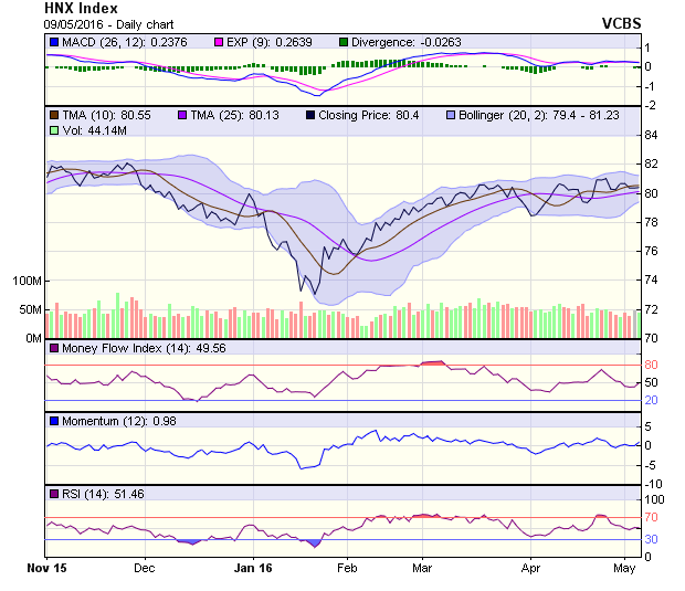 Chốt phiên, mặc dù HNX-Index tăng nhẹ nhưng toàn phiên giao dịch cho thấy áp lực giảm hiện diện trong biến động của chỉ số này. Phần thân nến hẹp với giá đóng – mở cửa chênh lệch không đáng kể kèm theo bóng trên dài cho thấy, mốc 81,2 điểm với sự hiện diện của cận trên dải bollinger vẫn là điểm dừng trong biến động của chỉ số. Khối lượng giao dịch trong các phiên gần đây hầu hết đều nằm dưới ngưỡng bình quân 20 phiên gần nhất cũng là một dấu hiệu kém tích cực báo hiệu sự hỗ trợ của dòng tiền đối với xu hướng là yếu và khả năng tạo lập nền giá cao hơn chưa được ủng hộ.