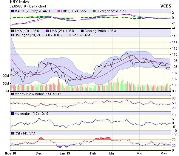 HNX-Index có diễn biến tương tự, khi chỉ số có phiên điều chỉnh trở lại sau hai phiên liên tiếp có được nhịp tăng nhẹ trên mốc tham chiếu. Hiện tại, với việc đang duy trì dưới MA20, kèm khối lượng giao dịch vẫn đang ở ở mức thấp.