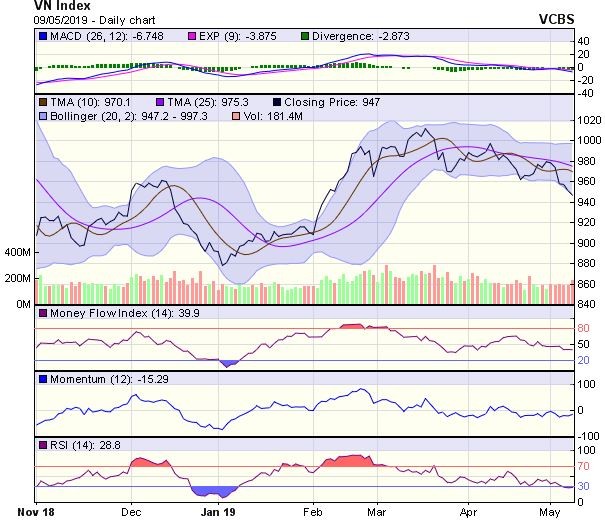 Chỉ số vẫn đang dao động trong kênh xu thế giảm được hình thành từ giữa tháng 03 trở lại đây. Đường giá hiện đang tiệm cận đường kênh dưới tương ứng với vùng 940-950 điểm.