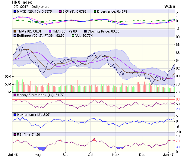 Xu hướng dài hạn của HNX-Index tiếp tục được duy trì tích cực, với vùng hỗ trợ trong khoảng 82,2-82,4 điểm (MA100-200). Dự đoán, HNX-Index sẽ tiếp tục tăng điểm trong phiên 11/1 để hướng đến kháng cự gần nhất tại 83,4 điểm, nếu điều chỉnh xảy ra thì vùng hỗ trợ gần nhất tại 82,2-82,4 điểm.