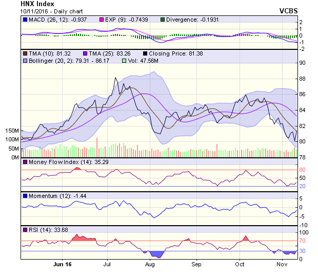 HNX-Index tăng điểm mạnh trong phiên 10/11, kết phiên với cây nến xanh khá giống mẫu hình bullish engulfing. Với phiên giao dịch tích cực này, tín hiệu trong ngắn hạn của chỉ số chuyển sang trung tính, với hỗ trợ tại 80,9 điểm (MA5) và vùng kháng cự trong khoảng 81,4-82 điểm. Xu hướng trong trung hạn vẫn là tiêu cực, với kháng cự trong khoảng 82,7-83,9 điểm (MA20-50-100). HNX-Index vẫn ở trong thị trường đi xuống (bear market), với kháng cự tại MA200 ở mức 82 điểm. Dự đoán xu hướng trong phiên 11/11, HNX-Index có thể tiếp tục tăng điểm để tiến vào vùng kháng cự 81,4-82 điểm.