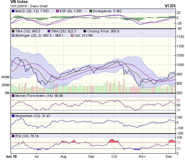 Dự báo, trong phiên giao dịch 11/12, VNIndex có thể sẽ có phiên thứ 6 liên tiếp giằng co và rung lắc trong khoảng giá 950-960 điểm trước khi bứt phá khỏi vùng đi ngang này.