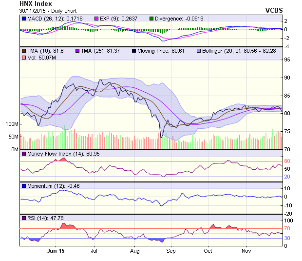 Trên đồ thị, thân nến giảm của phiên 30/11cho thấy mức độ tiêu cực được tăng cường khi HNX-Index đã cắt xuống phía dưới đường SMA 100. Trong khi đó, phân kỳ giá xuống tạo bởi đường giá của HNX-Index và MACD cũng đang được củng cố thông qua việc MACD lùi về sát đường zero báo hiệu rủi ro hình thành xu hướng giá xuống. Điểm sáng duy nhất là sự hiện diện của bóng dưới cùng khối lượng giao dịch lùi về dưới mức bình quân 22 phiên gần nhất cho thấy, cầu giá thấp đang phát huy vai trò hỗ trợ xu hướng và bán tháo không xuất hiện. Theo tín hiệu này, nếu HNX-Index sớm bình ổn và không để mất mốc hỗ trợ tiếp theo tại 80 điểm (mức đáy ngày 12/11 và SMA 60) thì rủi ro sẽ được giảm bớt.