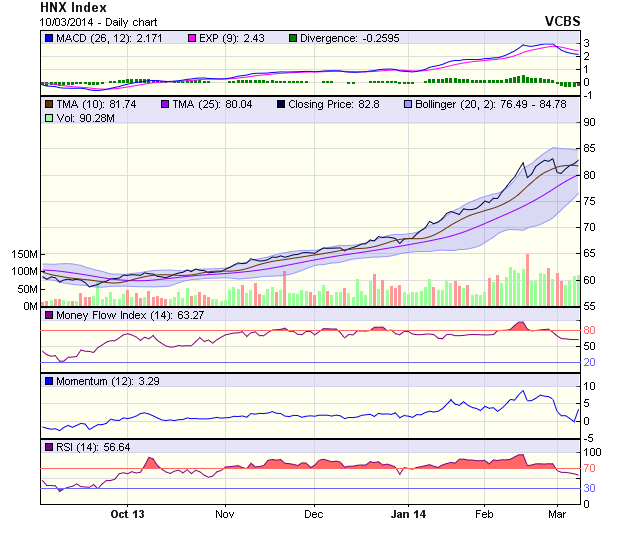 Ngắn hạn, sau một sóng tăng điểm mạnh, HNX-Index đang gặp cản tại vùng điểm 83-85.