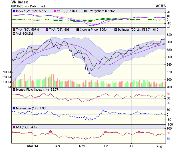 Sau khi vượt qua ngưỡng 600 điểm rất tốt nhưng VN-Index đang gặp phải ngưỡng cản ở mức 610 mà trong ba phiên vừa qua đường giá vẫn chưa bứt phá được để khẳng định xu hướng tăng bền vững VN-Index cần phải vượt qua ngưỡng này.