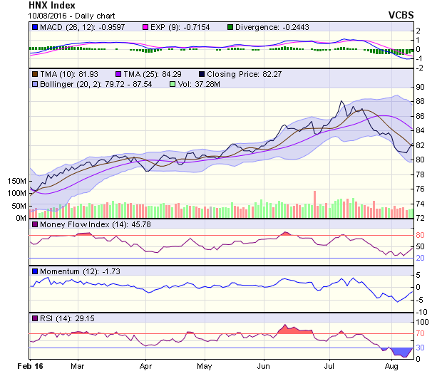 HNX-Index hình thành cây nến xanh marubozu thứ 2 liên tiếp, tiếp cận đường MA100. Thanh khoản có sự cải thiện nhẹ. RSI cho tín hiệu cắt lên đường 30, thoát khỏi vùng oversold. MACD cũng cho tín hiệu tích cực trở lại dưới đường 0. Vùng hỗ trợ 81 điểm. Vùng kháng cự 83 điểm.