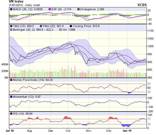 Dự báo, trong phiên giao dịch cuối cùng của năm Bính Tuất, VN-Index có thể sẽ tiếp tục giao dịch giằng co khó chịu với vùng kháng cự trong khoảng 915-920 điểm (MA50) và hỗ trợ gần nhất tại 905 điểm (MA20).