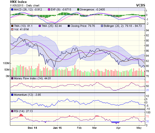 Đồ thị chỉ số HNX-Index cho thấy xung lực tăng thấp. Chỉ số dao động đi ngang quanh vùng 79,3 – 80,3 điểm. Nếu duy trì đi ngang trong vài phiên tới, sự điều chỉnh giảm sâu có thể xảy ra do dòng tiền chán nản sẽ tiến hành bán mạnh ra để thoát vị thế. Các chỉ báo kỹ thuật không cho tín hiệu rõ ràng. Đường Stochastic hồi phục tăng tích cực trong khi đường RSI có xu hướng giảm trở lại.