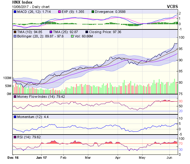 Tín hiệu kỹ thuật trung hạn của HNX-Index duy trì tích cực, với vùng hỗ trợ trong khoảng 91,6-93,6 điểm (MA5-10) và kháng cự gần nhất tại 98 điểm (đỉnh phiên 7/6). Về xu hướng dài hạn, HNX-Index tiếp tục vận động trong thị trường giá lên (bull market), với hỗ trợ tại 85,5 điểm (MA50).