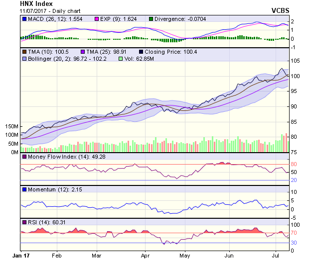 HNX-Index hồi phục nhẹ trong phiên 11/7 sau khi đã điều chỉnh mạnh 2 phiên trước đó. Tín hiệu kỹ thuật ngắn hạn của chỉ số vẫn duy trì tích cực, với kháng cự và hỗ trợ gần nhất lần lượt tại 101,4 điểm (MA5) và 100,4 điểm (MA10). Dự báo phiên 12/7, HNX-Index nhiều khả năng duy trì đà hồi phục để tiến gần hơn đến ngưỡng kháng cự tiếp theo tại 101,4 điểm.