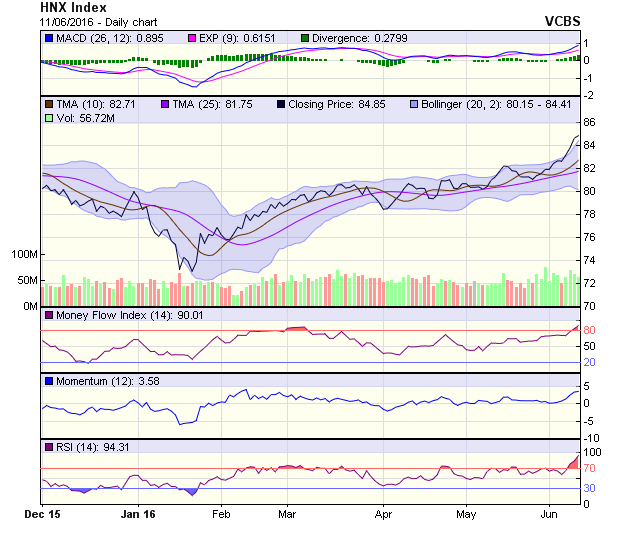 HNX-Index tiếp tục có mức tăng nhẹ, sau khi phá vỡ vùng kháng cự 84-84.5 điểm trong phiên giao dịch 9/6. Tuy nhiên, khả năng điều chỉnh trở lại của HNX-Index vẫn đang hiện hữu.