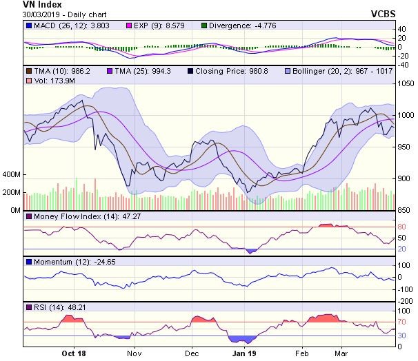VN-Index giảm 0,23% xuống 980,76 điểm. Thị trường duy trì đà tăng điểm trong phần lớn thời gian giao dịch nhưng bất ngờ quay đầu giảm điểm về cuối phiên.