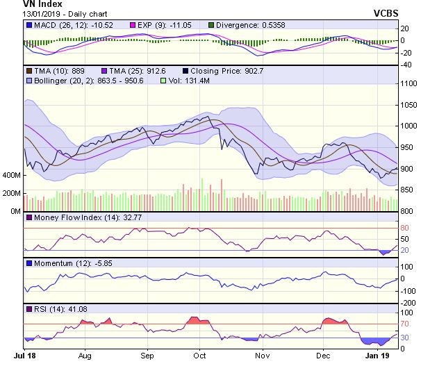 Dự báo, trong tuần giao dịch tiếp theo (14/1- 18/1), đà tăng của VN-Index có thể tiếp tục nhưng với dư địa không lớn với ngưỡng kháng cự mạnh tiếp theo tại 915 điểm (MA10 tuần).