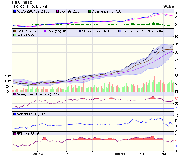 HNX-Index tiếp tục bật tăng 0,98 điểm sau một phiên điều chỉnh giảm. Theo đó HNX-Index đạt mức cao mới tại 84,15 điểm. Trên phương diện kỹ thuật, nhìn chung trong ngắn hạn thị trường vẫn có thể giằng co trong khoảng giá hẹp bởi các chỉ báo chưa đồng thời ủng hộ xu thế tăng điểm. Ngưỡng 85 điểm vẫn đóng vai trò là ngưỡng kháng cự trong ngắn hạn.