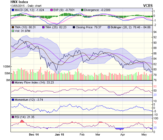 Đường trendline phía dưới đang đóng vai trò hỗ trợ cho chỉ số HNX-Index. Biên độ dao động tại vùng giá này thu hẹp cùng lượng giao dịch giảm cho dấu hiệu về việc chỉ số này đang trong quá trình tạo đáy. Khả năng điều chỉnh giảm sâu hơn là thấp. MACD tiếp tục duy trì dưới ngưỡng 0 và đã cắt xuống dưới đường tín hiệu. Tuy vậy RSI có dấu hiệu bật tăng trở lại cho dấu hiệu về việc momentum giảm điểm đang yếu dần.