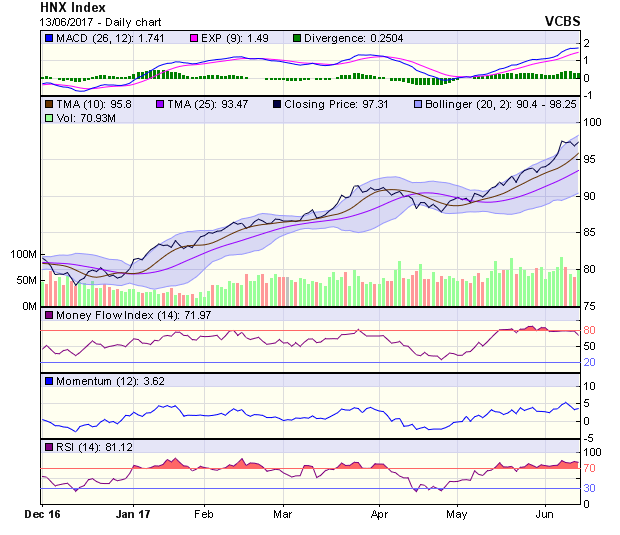 HNX-Index hồi phục trở lại. Tín hiệu kỹ thuật ngắn hạn của chỉ số duy trì tích cực, với vùng hỗ trợ trong khoảng 95,9-97,2 điểm và kháng cự gần nhất tại 98 điểm (đỉnh phiên 7/6). Dự báo, phiên 14/6, HNX-Index nhiều khả năng tiếp tục tăng điểm để hướng đến mốc kháng cự tiếp theo tại 98 điểm, vùng hỗ trợ cho chỉ số trong khoảng 95,9-97,2 điểm.