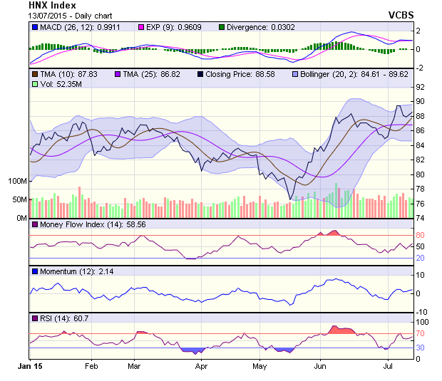 Chỉ số HNX- Index tiếp tục duy trì trên mốc 88 điểm. Xu hướng giao dịch tích lũy trong biên độ hẹp tiếp tục được duy trì. Cần có phiên bật tăng khỏi mốc 90 điểm mới có thể khẳng định đà tăng của chỉ số này trở lại. Các chỉ báo kỹ thuật vẫn duy trì đà tăng tích cực cho thấy khả năng giảm điểm trong ngắn hạn là thấp. Tuy vậy xung lực tăng đang khá yếu do vậy xu hướng đi ngan trong biên độ hẹp sẽ tiếp tục diễn ra.