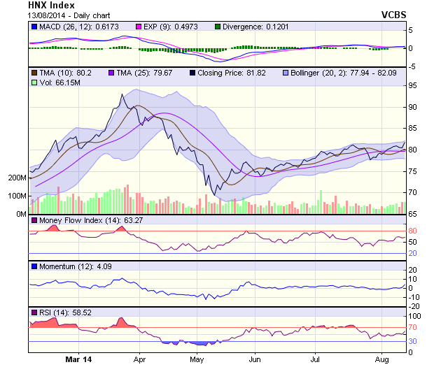 Chỉ  số  HNX-Index bất ngờ tăng điểm mạnh mẽ hơn VN-Index với xung lực tới từ các cổ phiếu trụ cột thuộc dòng dầu khí như PVS, PVC, PGS... cùng với sự tăng điểm đồng loạt của các mã trụ khác như KLS, SHB,SHS, SCR... Mốc cản tiếp theo của chỉ số này là 83,5. Xung lực tăng điểm đã mạnh dần lên khi chỉ số này tăng điểm mạnh mẽ với độ rộng thị trường được mở rộng tích cực.