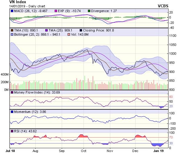 Dự báo, trong phiên giao dịch tiếp theo 15/1, VN-Index có thể sẽ tiếp tục giằng co với kháng cự gần nhất tại 905 điểm (MA20).
