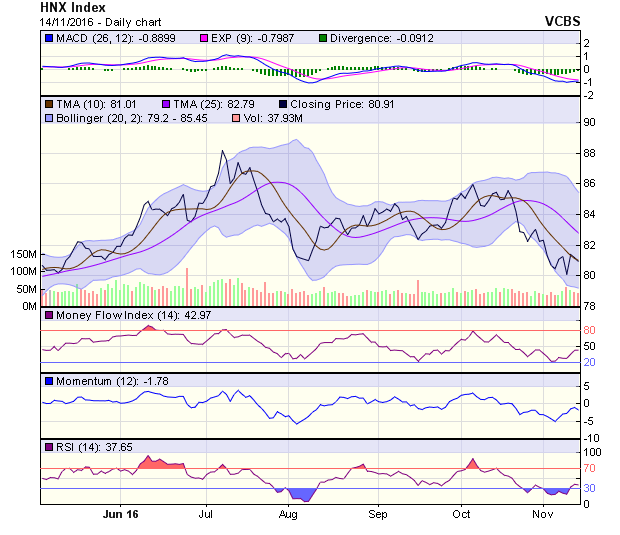 HNX-Index kết phiên với cây nến đỏ có bóng dưới dài hơn hẳn bóng trên cho thấy lực bắt đáy khá mạnh. Với phiên giao dịch này, tín hiệu trong ngắn hạn của chỉ số chuyển sang tiêu cực, với kháng cự trong khoảng 81-81,1 điểm (MA5-10). Xu hướng trong trung hạn vẫn là tiêu cực, với kháng cự trong khoảng 82,3-83,8 điểm (MA20-50-100). HNX-Index vẫn tiếp tục trong thị trường đi xuống (bear market) với kháng cự tại MA200 ở mức 82,1 điểm. Dự đoán xu hướng trong phiên 15/11, HNX-Index có thể hồi phục nhẹ về vùng kháng cự 81-81,2 điểm.
