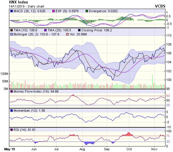 HNX-Index cũng có phiên giảm điểm. Tuy nhiên, chỉ số vẫn duy trì đóng cửa trên MA20, kèm theo đường +DI nằm trên –DI, cho thấy xu hướng chính vẫn là phục hồi, trong trường hợp, giữ được trên vùng hỗ trợ xu hướng quanh 105,7-106 điểm (MA20 và vùng đỉnh 10/2019) thì chỉ số sẽ có cơ hội phục hồi trở lại.