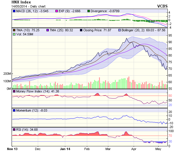 HNX-Index tăng trở lại khá mạnh trong phiên 14/5. Dù tăng mạnh, phiên này chưa thể thay đổi xu hướng giảm hiện hữu của HNX-Index khi những nguyên tắc đỉnh-đáy liền sau thấp hơn tiếp tục còn hiệu lực.