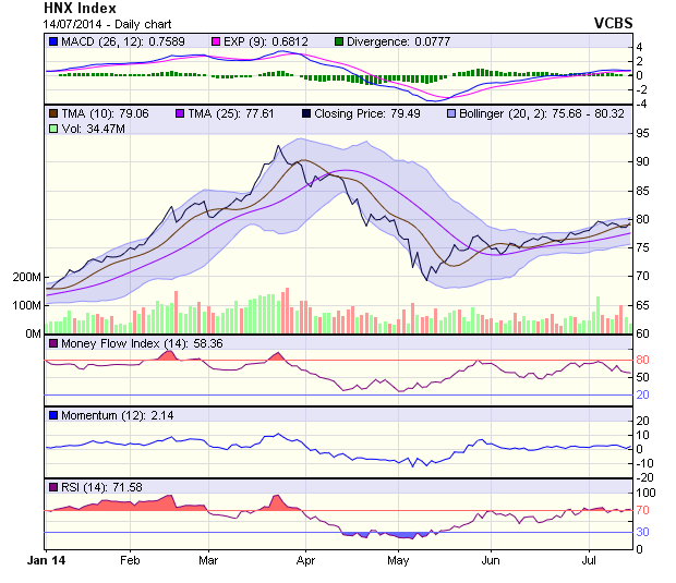 Trên sàn HNX, các chỉ báo kỹ thuật tuy nhích nhẹ tăng điểm trở lại, nhưng tín hiệu vẫn tỏ ra chưa thực sự mạnh mẽ, khi RSI, MACD, MFI chủ yếu vẫn dao động trong biên độ hẹp. Ngưỡng hỗ trợ - kháng cự trong ngắn hạn của HNX-Index lần lượt là 76 – 80 điểm.