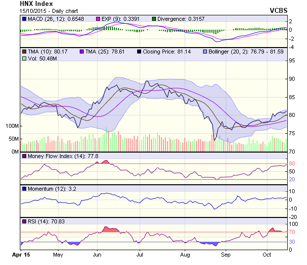 Về chỉ báo, tín hiệu của RSI đã được cải thiện theo mức tăng của VN-Index phiên 15/10 và một lần nữa hướng về mốc quá mua. Tuy nhiên, do nhóm chỉ báo nhanh gồm Stochastic Oscillator, Williams %R giữ trạng thái lình xình trên vùng “quá mua” gần với mốc cực đại nên dư địa tăng giá là không lớn.