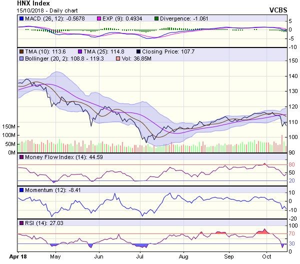 HNX-Index có diễn biến tương tự. Chỉ số có phiên giảm điểm mạnh với vol thấp và tiếp tục duy trì đóng cửa dưới các đường MA100 và MA200, cho thấy áp lực điều chỉnh trong trung hạn hiện đang mạnh dần lên.