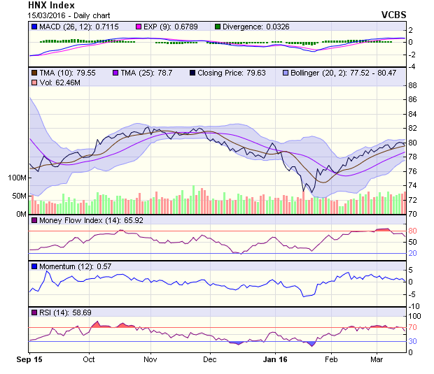 Đối với HNX-Index, vùng 79-80 điểm là vùng kháng cự mạnh nên áp lực chốt lời ngắn hạn có thể đang xảy ra. Một số chỉ báo như RSI, Stochastic Oscillators đang cho tín hiệu yếu trong ngắn hạn.