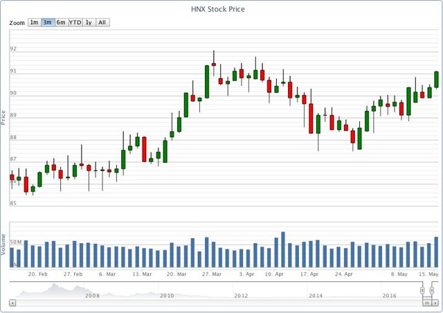 HNX-Index tăng điểm khá tốt phiên thứ 2 liên tiếp. Tín hiệu kỹ thuật ngắn hạn duy trì tích cực, với vùng hỗ trợ trong khoảng 90-90,4 điểm (MA5-10). Dự báo phiên 16/5, HNX-Index nhiều khả năng tiếp tục tăng điểm với kháng cự tại 91,2 điểm (đỉnh phiên 11/4) và xa hơn là 91,8 điểm (đỉnh phiên 4/4). Vùng hỗ trợ trong khoảng 90-90,4 điểm.