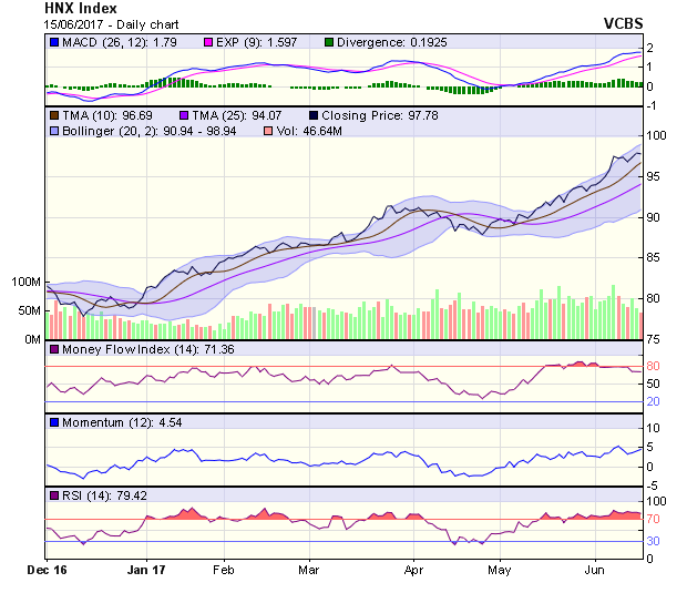 Tuy vậy, đà giảm của VN-Index chưa gây ảnh hưởng đến những tín hiệu xu hướng tăng có được trong phiên 14/6. MACD tiếp tục tăng mở rộng với đường tín hiệu, còn các chỉ báo xung lượng RSI và Stochastic duy trì trong khu vực quá mua.