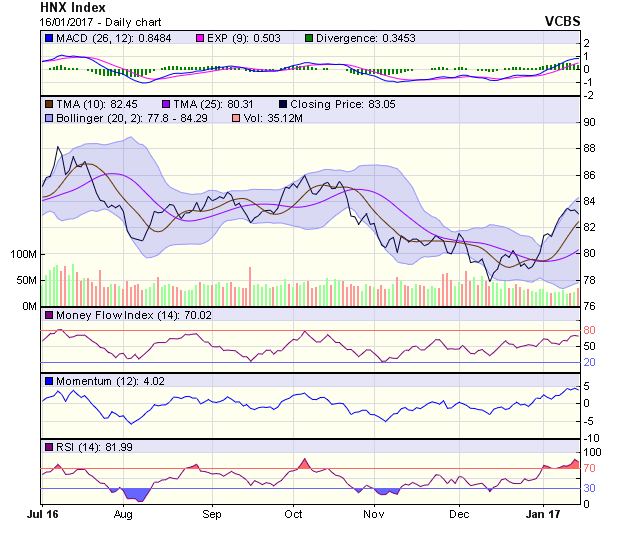 HNX-Index cũng giảm điểm, nên tín hiệu kỹ thuật ngắn hạn chuyển từ tích cực xuống trung tính, với hỗ trợ tại 82,5 điểm (MA10) và kháng cự tại 83,2 điểm (MA5). Tín hiệu kỹ thuật trung hạn tiếp tục tích cực, với hỗ trợ gần nhất tại 81 điểm (MA20). HNX-Index tiếp tục duy trì trong thị trường giá lên (bull market), với hỗ trợ gần nhất tại 82,5 điểm (MA200). Trong phiên 17/1, HNX-Index có thể hồi phục để kiểm nghiệm lại ngưỡng kháng cự gần nhất tại 83,2 điểm (MA5), rủi ro điều chỉnh vẫn hiện hữu, với hỗ trợ gần nhất tại 82,5 điểm (MA10).