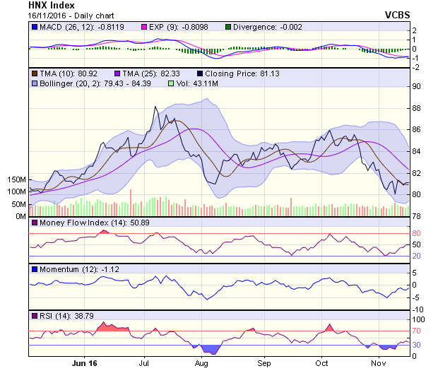 HNX-Index đi ngang trong phiên 16/11, kết phiến với cây nến xanh doji thể hiện sự giằng co cân bằng giữa bên mua và bán. Với phiên giao dịch giằng co này, tín hiệu trong ngắn hạn của chỉ số vẫn ở mức trung tính, với hỗ trợ tại 80,9 điểm (MA10) và kháng cự tại 81,2 điểm (MA5). Xu hướng trong trung hạn vẫn là tiêu cực, với kháng cự gần nhất tại mức 81,9 điểm (MA20). HNX-Index vẫn dao động trong thị trường giá xuống (bear market) với kháng cự tại MA200 ở mức 82,2 điểm. Dự đoán xu hướng trong phiên 17/11, HNX-Index có thể tiếp tục giằng co trong biên độ hẹp 80,9-81,6 điểm.