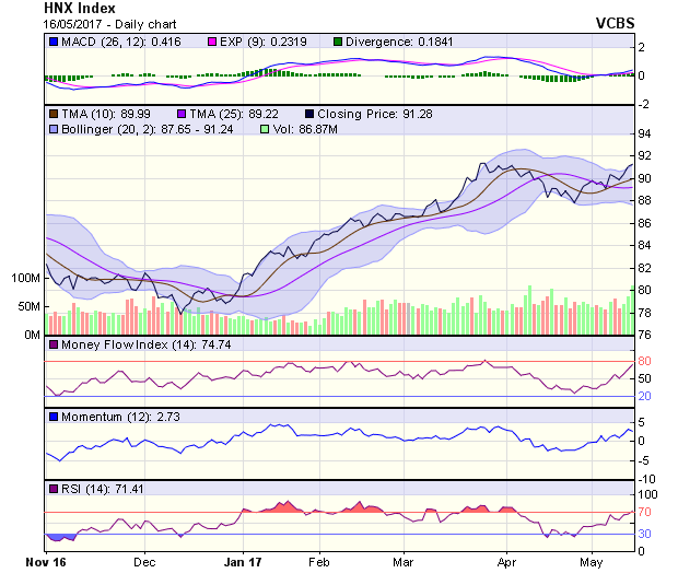 Chỉ báo tâm lý đang duy trì tín hiệu tích cực, phản ánh tâm lý nhà đầu tư đang khá tốt. Tín hiệu này củng cố cho xu hướng tăng trong phiên 17/5. Bên cạnh đó, hệ thống chỉ báo xu hướng ngắn hạn duy trì tính hiệu Tăng trên VN-Index và HNX-Index, với mức hỗ trợ tại vùng 715-717 và 88.8-89. Do các tín hiệu đảo chiều vẫn chưa rõ nét và trong trạng thái giằng co, nên VN-Index có thể tiếp tục giao dịch trong biên độ hẹp 720-730.