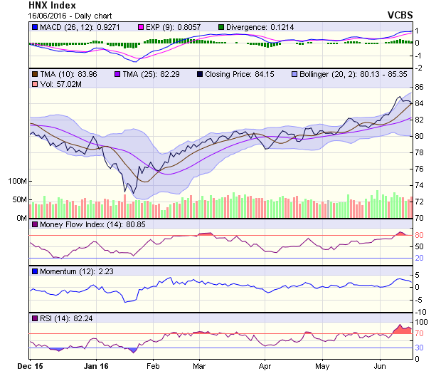 Khối lượng giao dịch tăng khá mạnh, hơn 24%, chấm dứt chuỗi 5 phiên giảm liên tiếp. Tuy nhiên, diễn biến này cũng không hoàn toàn tích cực. Khối lượng giao dịch tăng trong khi điểm số giảm cho thấy, khả năng hoạt động chốt lời đã gia tăng mạnh hơn trong phiên 16/6. Ngưỡng 84 điểm đã chống đỡ tốt cho HNX-Index trong bốn phiên giao dịch gần đây, nhưng có thể sẽ bị thử thách mạnh hơn trong phiên giao dịch sắp tới.