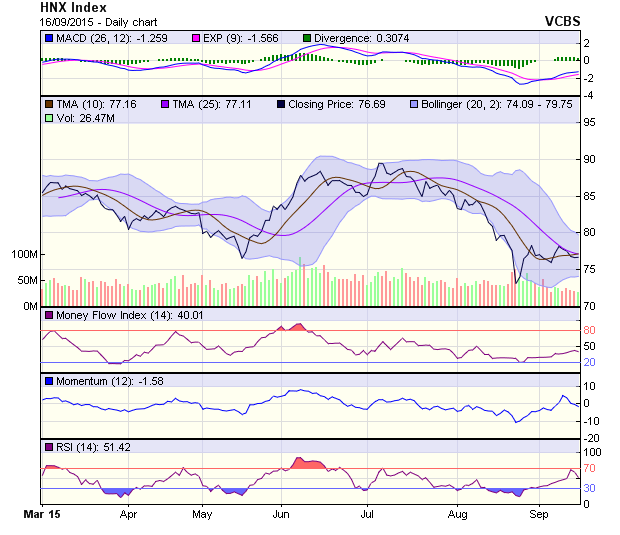HNX-Index tiếp tục về kiểm nghiệm ngưỡng hỗ trợ 75-76 điểm, mặc dù đường giá vẫn giảm nhẹ, chỉ số này liên tiếp hình thành các mẫu hình doji thể hiện tâm lý bên mua về cuối phiên có biến động tích cực hơn. Thanh khoản giao dịch thấp cho thấy sự do dự của nhà đầu tư nhưng trong giai đoạn này biến động lên xuống của đường giá đóng vai trò quan trọng hơn. Tín hiệu của hai đường MA vẫn đang đi xuống. Các chỉ báo kỹ thuật cũng đang biến động kém tích cực, đường RSI(14) giảm nhẹ, trong khi đường MACD đà tăng cũng có dấu hiệu chững lại.