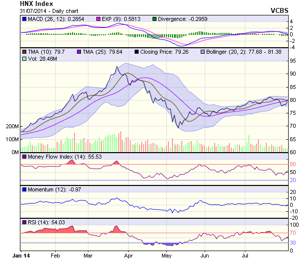Trên sàn HNX, SO, RSI đảo chiều hướng lên trên cùng DI cũng thu hẹp lại. Tuy nhiên với thanh khoản vẫn khá yếu thì xu hướng của HNX-Index vẫn chưa có sự thay đổi nào. Theo đó xác suất giảm điểm là vẫn còn, với ngưỡng hỗ trợ gần nhất của HNX-Index là ngưỡng 76 điểm.