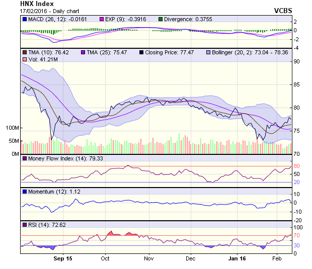 HNX-Index tăng điểm tích cực nhờ lực cầu xuất hiện trở lại tại nhiều cổ phiếu trụ cột, qua đó chính thức vượt qua được ngưỡng kháng cự 77,58 điểm, tương ứng với MA50. Các chỉ báo Stochastic Oscillator, MACD, RSI đều đang cho những tín hiệu tích cực. Chỉ số này nhiều khả năng sẽ test lại ngưỡng này trước khi chính thức bứt phá nếu như lực cầu tiếp tục duy trì tích cực.