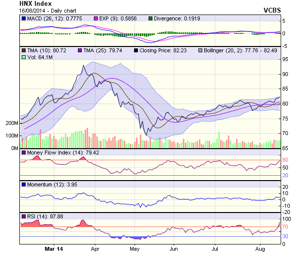 Trên đồ thị nến, HNX-Index tiếp tục hình thành cây nến xanh nhỏ thể hiện xu hướng tăng vẫn đang được duy trì. Bên cạnh đó, khối lượng giao dịch trong 3 phiên tăng vừa qua đều tăng lên trên mức bình quân 10 phiên cho thấy dòng tiền đang vào khá ổn định nhưng chỉ tập trung mạnh vào nhóm cổ phiếu dầu khí. Nhìn chung, HNX-Index vẫn đang bị cản bởi ngưỡng kháng cự 83 điểm, nếu vượt qua được ngưỡng này đường giá có khả năng sẽ tăng mạnh hơn. Các chỉ báo kỹ thuật duy trì tín hiệu tích cực, RSI tiếp tục đi lên trong khi đường cỏ MACD cũng mọc dài hơn trên đường 0.