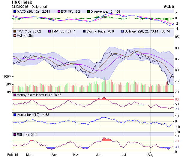 Đồ thị HNX-Index tạo thành 1 Engulfing pattern, lùi về sát mốc hỗ trợ 76 điểm cho thấy áp lực điều chỉnh đang diễn ra mạnh. Vùng 80.5-81.6 điểm sẽ đóng vai trò kháng cự và mốc 76 điểm sẽ là mốc hỗ trợ trong ngắn hạn cho chỉ số này. Các chỉ báo kỹ thuật đều cho tín hiệu phục hồi và tạm thời suy yếu nhẹ.