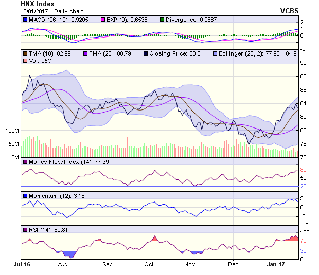 Dự báo phiên 18/1, chỉ số có thể duy trì đà giảm điểm để kiểm nghiệm lại ngưỡng hỗ trợ 83 điểm, chỉ số cần tích lũy trong khoảng 83-83,4 điểm, sau đó có thể sẽ bật tăng để hướng đến kháng cự tại 86 điểm.