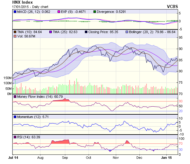 VN-Index giảm mạnh hơn về cuối phiên hình thành cây nến đỏ. Như vậy VN-Index đã có ba cây nến đỏ liên tiếp, có bóng nến phía trên dài hơn thể hiện áp lực bán ra mạnh hơn. Khối lượng giao dịch trong các phiên giảm cũng cao hơn các phiên tăng cho thấy lượng bán gia đã gia tăng khi VN-Index tiến tới ngưỡng kháng cự 580 điểm. Trong trường hợp thị trường có điều chỉnh lại, ngưỡng hỗ trợ cho VN-Index sẽ ở trong vùng 550-560 điểm, tương ứng với sự hỗ trợ của đường MA26. Tuy nhiên, ba cây nến đỏ liên tiếp nhưng vẫn nằm trong thân cây nến tăng ngày 13/1, nên cũng tiềm ẩn cơ hội cho đường giá tiếp tục gia tăng. Các chỉ báo kỹ thuật có những tín hiệu suy yếu, đường RSI đang hướng xuống, trong khi đường MACD histogram cũng mọc thấp hơn trên đường 0.
