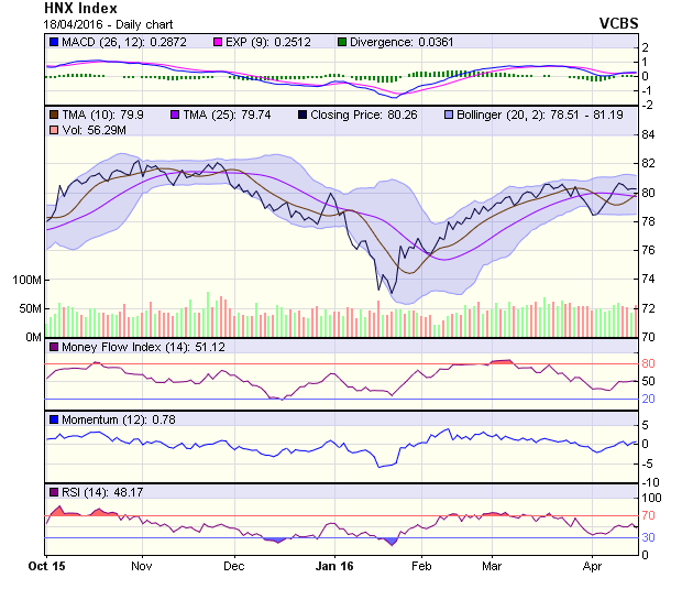 Kết thúc tuần giao dịch, HNX-Index hình thành 1 cây nến doji, qua đó cho thấy, tâm lý giao dịch của nhà đầu tư hiện tại vẫn thiếu ổn định. Thanh khoản gia tăng cho thấy, dòng tiền đã quay trở lại sau 2 tuần giao dịch lình xình liên tiếp. RSI và MACD tiếp tục cho tín hiệu khá tích cực trong ngắn hạn, áp lực giảm mạnh do đó khó có thể xảy ra. HNX-Index nhiều khả năng sẽ có xu hướng giao dịch đi ngang trong vùng 80-81 điểm vào tuần này.