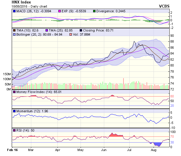 HNX-Index hình thành cây nến đỏ doji, giao dịch giằng co tiếp tục diễn ra. Thanh khoản duy trì ở mức trung bình. MACD tiếp tục cho tín hiệu đi lên trên đường 0. RSI hiện vẫn nằm ngay dưới đường 70. Dải bollinger cho tín hiệu co hẹp lại. Vùng hỗ trợ 82 điểm. Vùng kháng cự 84 điểm.