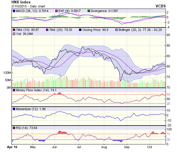 HNX-Index vẫn đang duy trì khá tốt xu hướng tăng điểm, đồng thời được kỳ vọng sẽ tiến đến thử thách vùng kháng cự mạnh 82,5-83 điểm trong ngắn hạn. Tuy nhiên, chỉ số này có thể cũng sẽ cần thêm một vài phiên điều chỉnh tích lũy quanh ngưỡng cản 81 điểm, trước khi tiếp tục xu hướng tăng điểm trong thời gian tới.