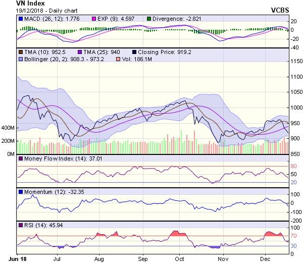 VN-Index giảm 0,86% xuống 919,24 điểm. Áp lực giảm điểm diễn ra trong suốt phiên giao dịch nhưng có dấu hiệu hồi phục dần về cuối phiên. Điều này được kỳ vọng sẽ giúp thị trường có diễn biến khởi sắc hơn trong phiên kế tiếp.