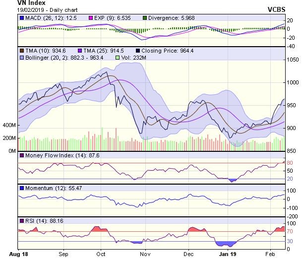 có phiên tăng điểm thứ hai liên tiếp. Không những vậy, xu hướng phục hồi của chỉ số vẫn đang tiếp diễn, khi chỉ số tiếp tục duy trì đóng cửa trên hầu hết các đường MA quan trọng từ MA5 tới MA200, kèm theo đường ADX đi lên vùng 25 và đường +DI nằm trên –DI hàm ý xác nhận xu hướng phục hồi hiện tại, cơ hội chỉ số có thể vượt vùng đỉnh thiết lập ở tháng 12/2018, lên thử thách ngưỡng kháng cự tâm lý 1.000 điểm.