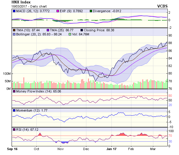 Về xu hướng dài hạn, HNX-Index đang vận động trong thị trường giá lên (bull market), với hỗ trợ tại 83,1 điểm (MA20). Dự báo, trong tuần giao dịch này, HNX-Index sẽ có xu hướng điều chỉnh trở lại để kiểm tra lực cầu quanh mốc hỗ trợ tại 87,1 điểm. Vùng kháng cự tiếp theo của chỉ số được xác định tại 90 điểm.