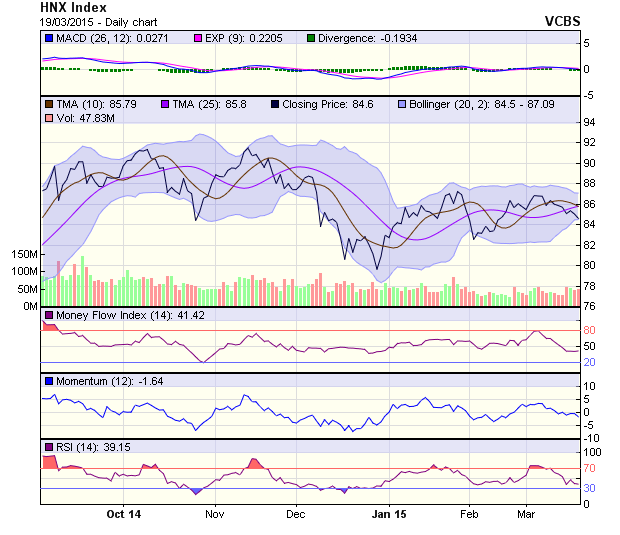 Đồ thị chỉ số HNX-Index tiếp tục tạo thành 1 Doji với thân nến ngắn và đuôi nến phía trên khá dài. Điều này cho thấy tâm lý nhà đầu tư đang khá thận trọng tại vùng giá hiện tại. Tuy vậy, chỉ số này vẫn nằm trên kênh tăng điểm ngắn hạn. Các đường chỉ báo kỹ thuật tiếp tục cho các tín hiệu kém tích cực.
